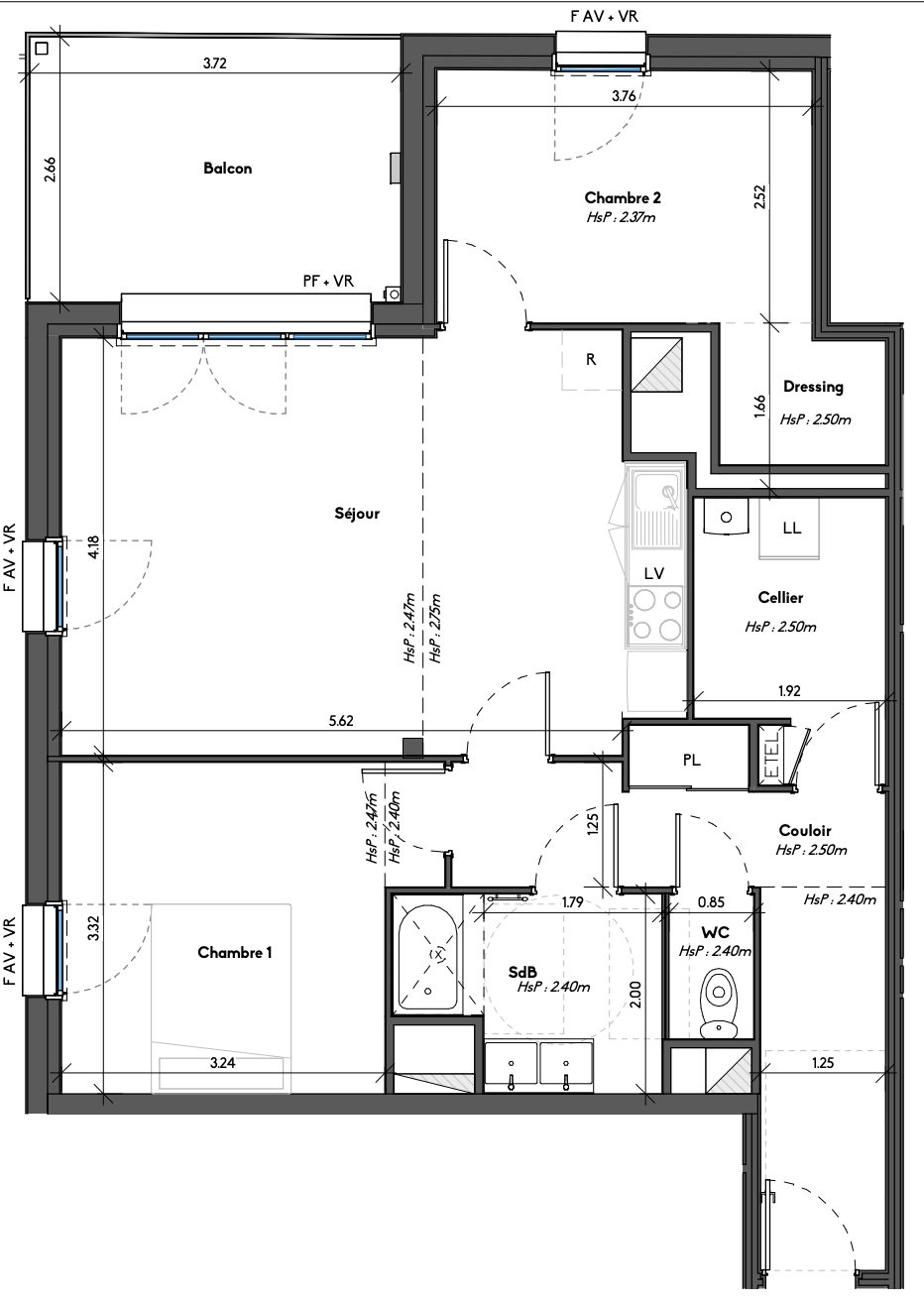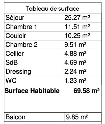 Ce spacieux T3 de 69,58m2 est situé au 2è étage et comprend : – Séjour 25,27 expo sud-ouest et nord/ouest, cellier, wc séparé, entrée, – Suite parentale avec dressing, 2è chambre, salle de bains – Belle loggia de 9,85m2 (3,72m par 2,66m) – Parking inclus