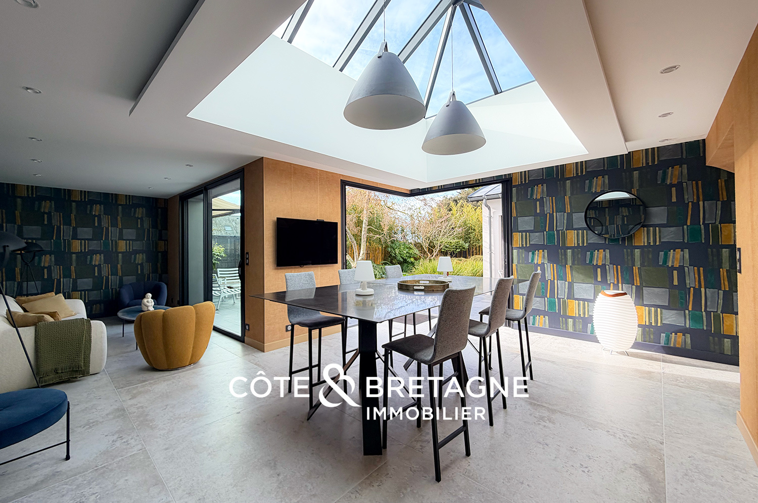 Maison d’architecte à Binic Élégance contemporaine & volumes généreux Édifiée en 1990 pour la partie centrale et développant environ 278 m2 habitables aujourd’hui, cette maison d’architecte aux lignes affirmées s’inscrit avec justesse dans son environnement résidentiel de Binic-Étables-sur-Mer. Pensée dès l’origine pour privilégier la circulation et la lumière, elle a bénéficié de deux extensions harmonieuses ainsi que d’une rénovation intégrale de sa partie initiale : plomberie, électricité, décoration, chauffage au sol par géothermie, menuiseries aluminium double vitrage… Chaque intervention a été réalisée avec exigence, dans une recherche constante de confort et de cohérence architecturale. L’ensemble dévoile une demeure contemporaine aux prestations abouties, où les volumes dialoguent naturellement avec le jardin paysager.