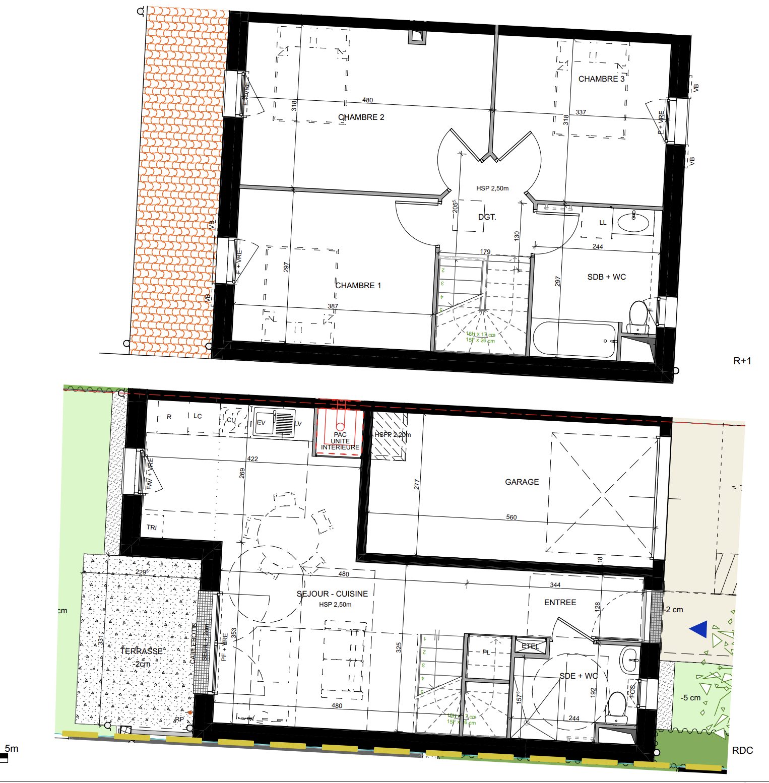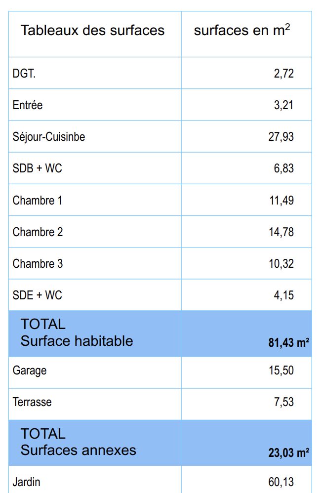 Maison T4 tout finie (sauf cuisine) : peintures, salles d’eau, sols, faïence, jardin engazonné et clôturé : – Séjour + entrée 30m2 expo sud ouest, salle d’eau, wc, garage, terrasse et jardin 60m2 au rez de chaussée – A l’étage : 3 chambres 14,78-11,49-10,32m2, salle de bains, wc.