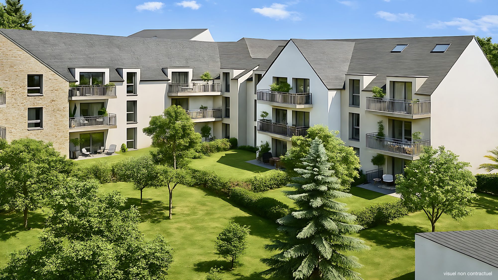 Prestations standing : Parquet dans les chambres, carrelage grand format et faïence, wc suspendus, volets roulants électriques, receveur douche extra-plat, chaudière gaz individuelle, logement connecté, placards aménagés, baies vitrées alu coulissantes.