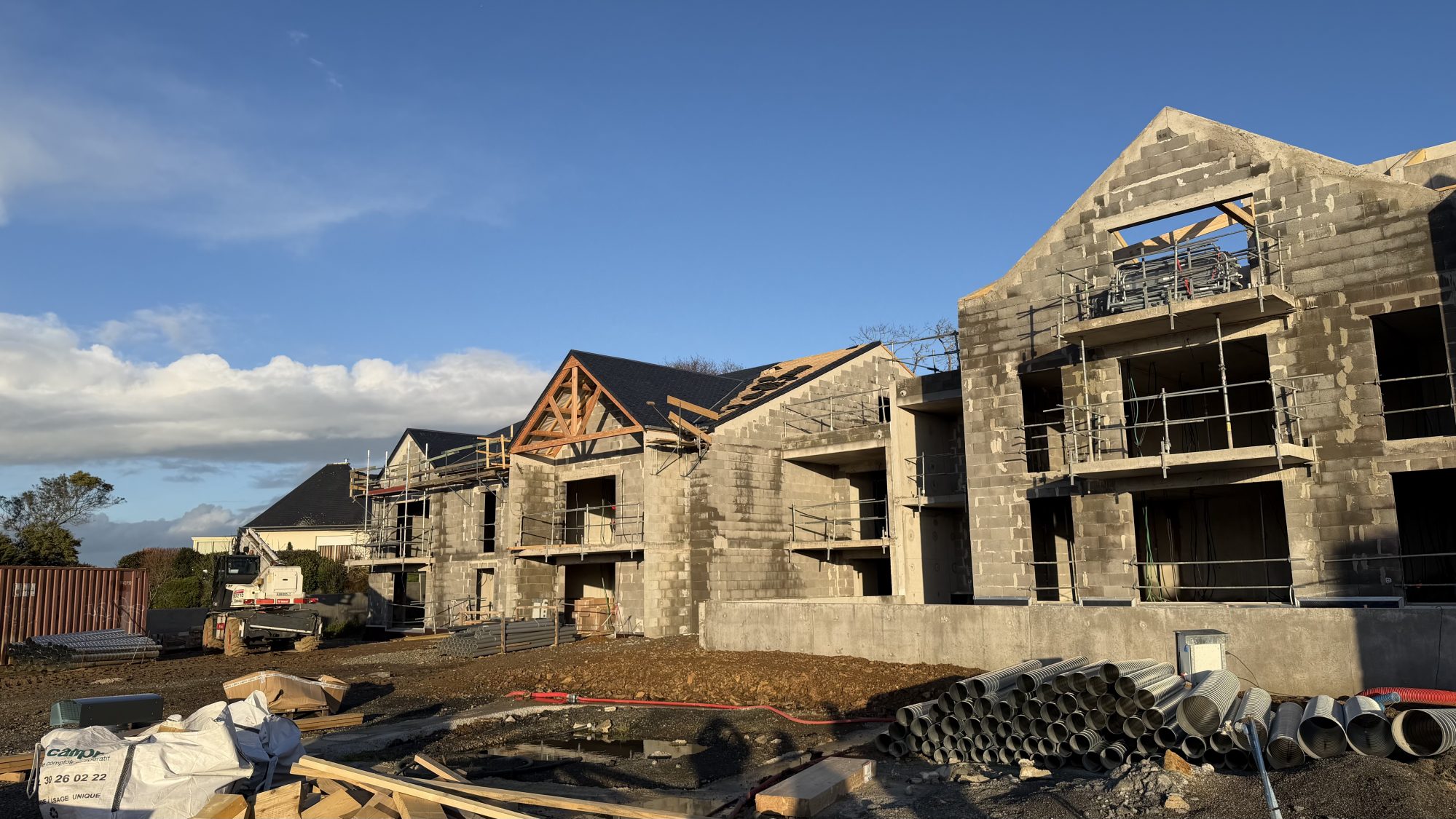 Nouvelle réalisation entre Terre et Mer, à pied du Centre Bourg et 1,5km des plages et du Golf. Une petite résidence à taille humaine, au calme, entourée de champs, sur les hauteurs, offrant de belles vues dominantes. Livraison fin 2026, travaux en cours.