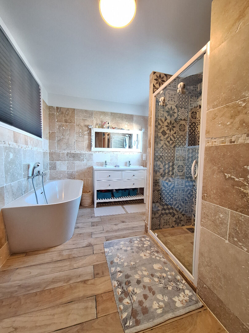 Au rez-de-chaussée: Entrée avec rangements et WC séparés, séjour-salon avec poêle à granulés, cuisine semi-ouverte entièrement aménagée et équipée, buanderie et grand salon indépendant avec accès jardin-terrasse.