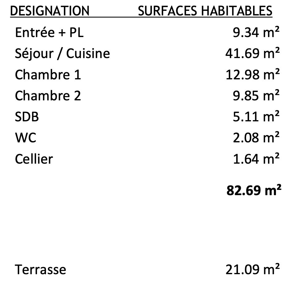 Superbe T3bis de 82,69m2 au 4è étage avec une terrasse de 21,09m2 exposée sud ouest comprenant : – Séjour 41,69m2 – Deux Chambres 12,85-9,85m2 – Salle d’eau douche à l’italienne, wc séparés, entrée, cellier – Double parking inclus