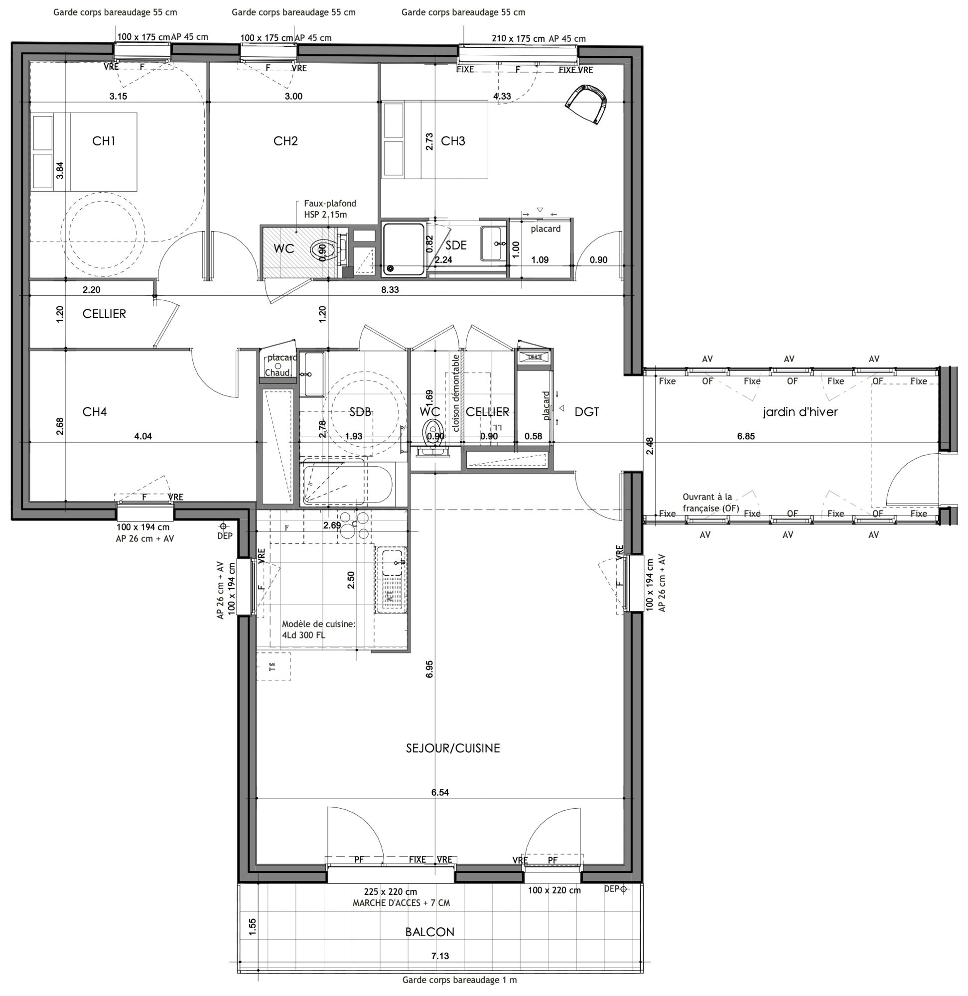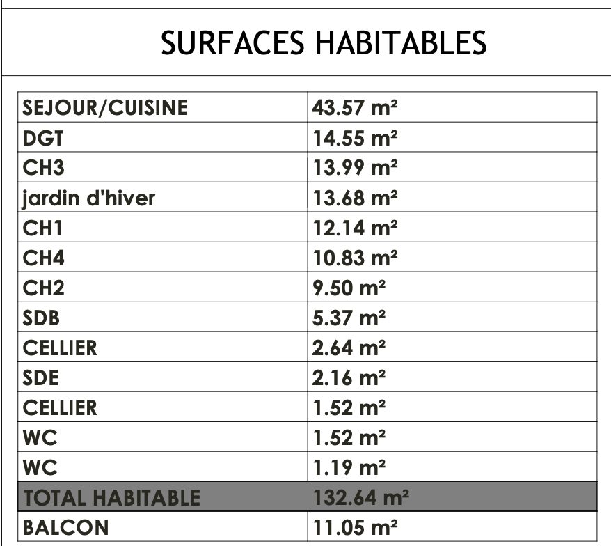 Spacieux T5 au 4è étage exposé sud-ouest de 132m2 comprenant : – Séjour 43,57m2 – Jardin d’hiver de 13,68m2 et terrasse 11m2 – Suite parentale avec salle d’eau attenante (14+2m2) – 3 autres chambres 12-11-10m2 – Salle de bains, deux wcs, cellier, placards – Double parking sous sol inclus.